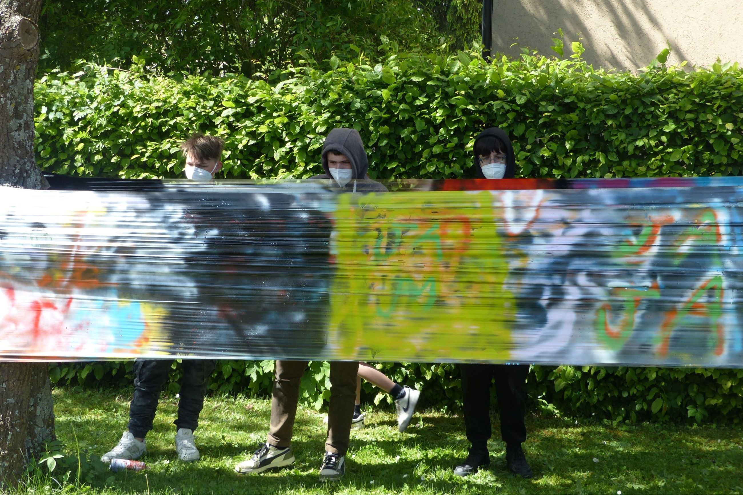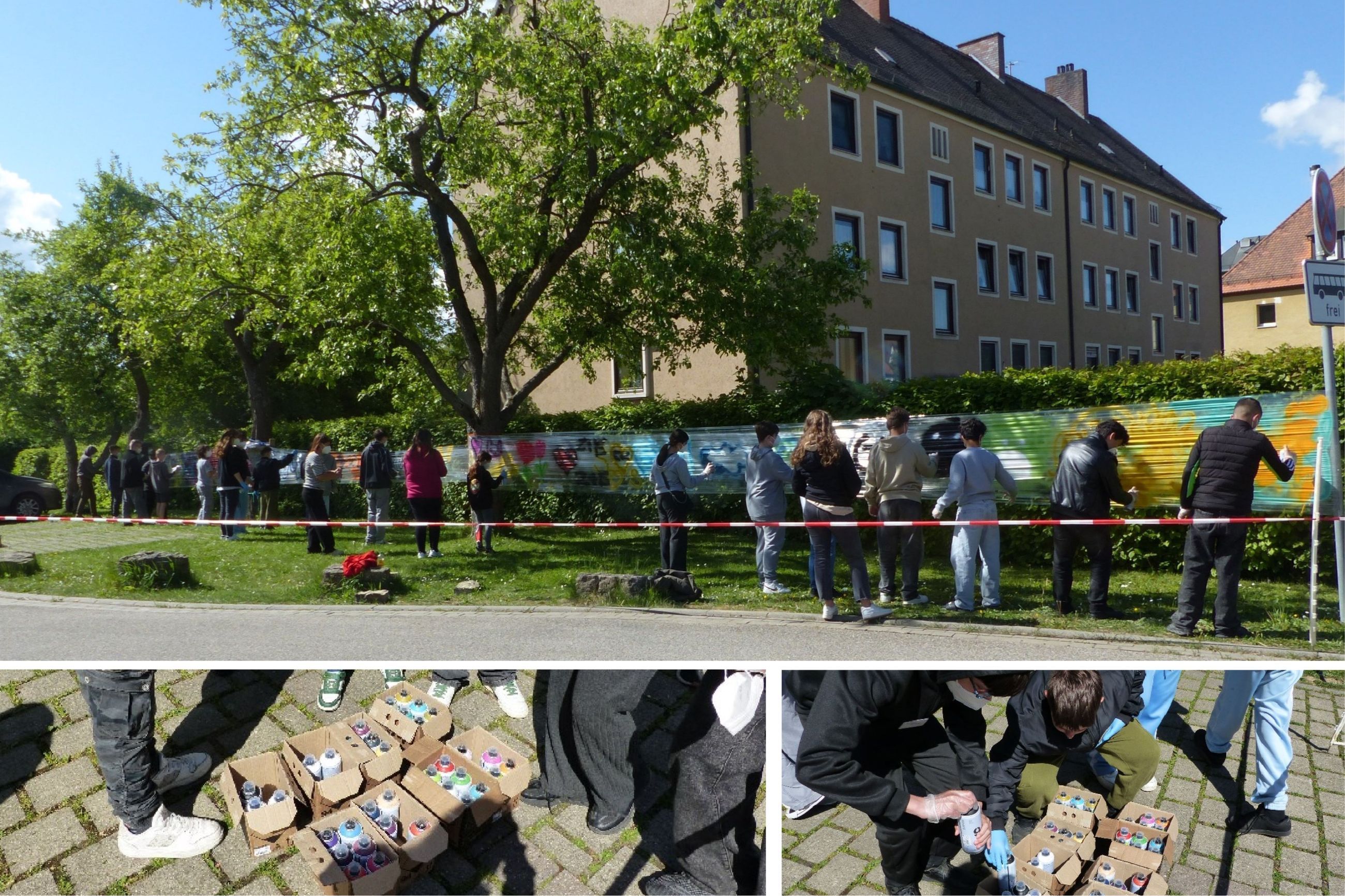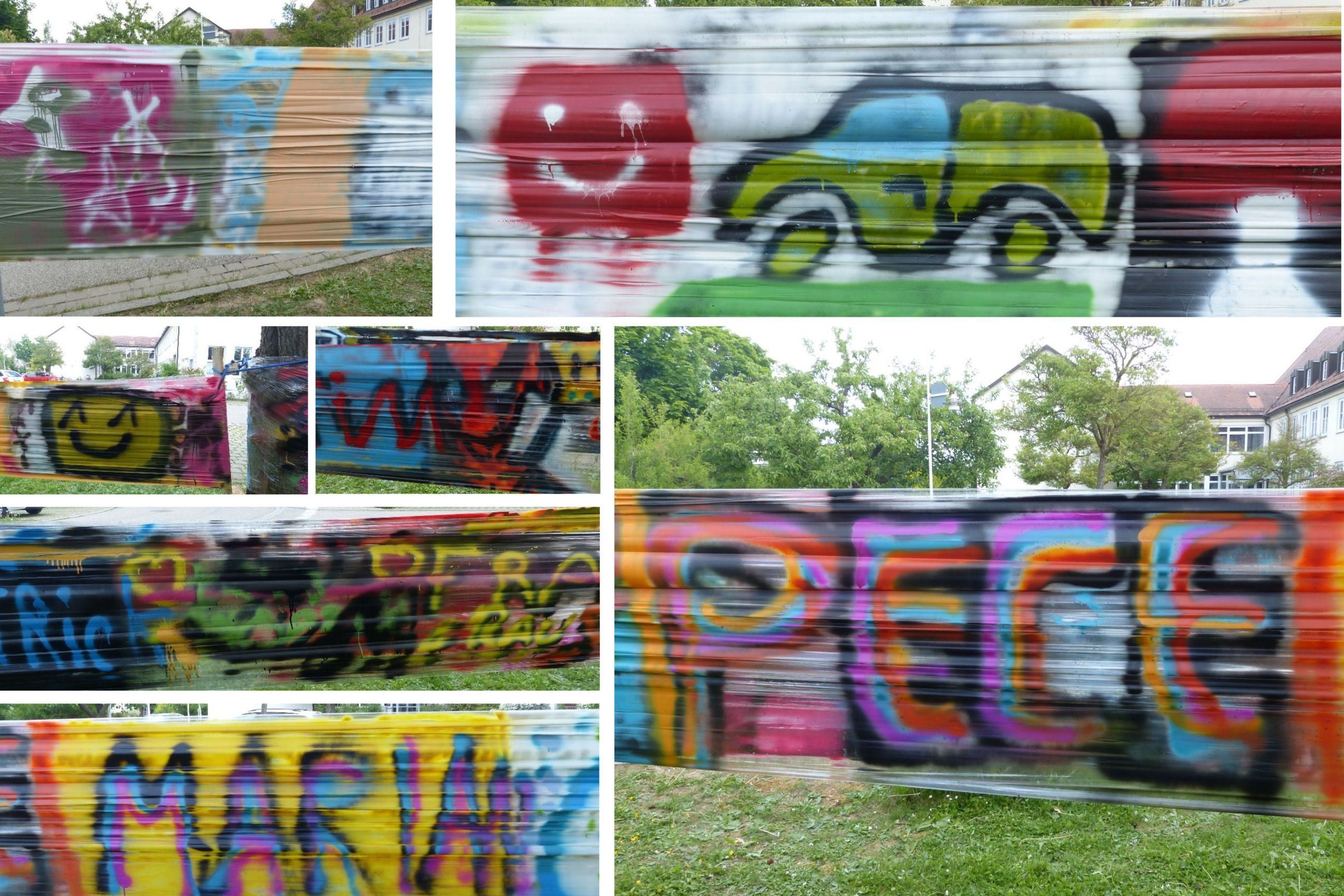 Dazu waren auf dem Gelände des Förderzentrums Rothenburg unter Leitung von Hern Hofmann Folienbahnen zum Besprayen erichtet worden. Unter der Beachtung wichtiger „Sprayregeln" ließen die Schülerinnen und Schüler ihren kreativen Vorstelungen freien Lauf und erstelten ein beachtenswertes Gesamtkunstwerk.