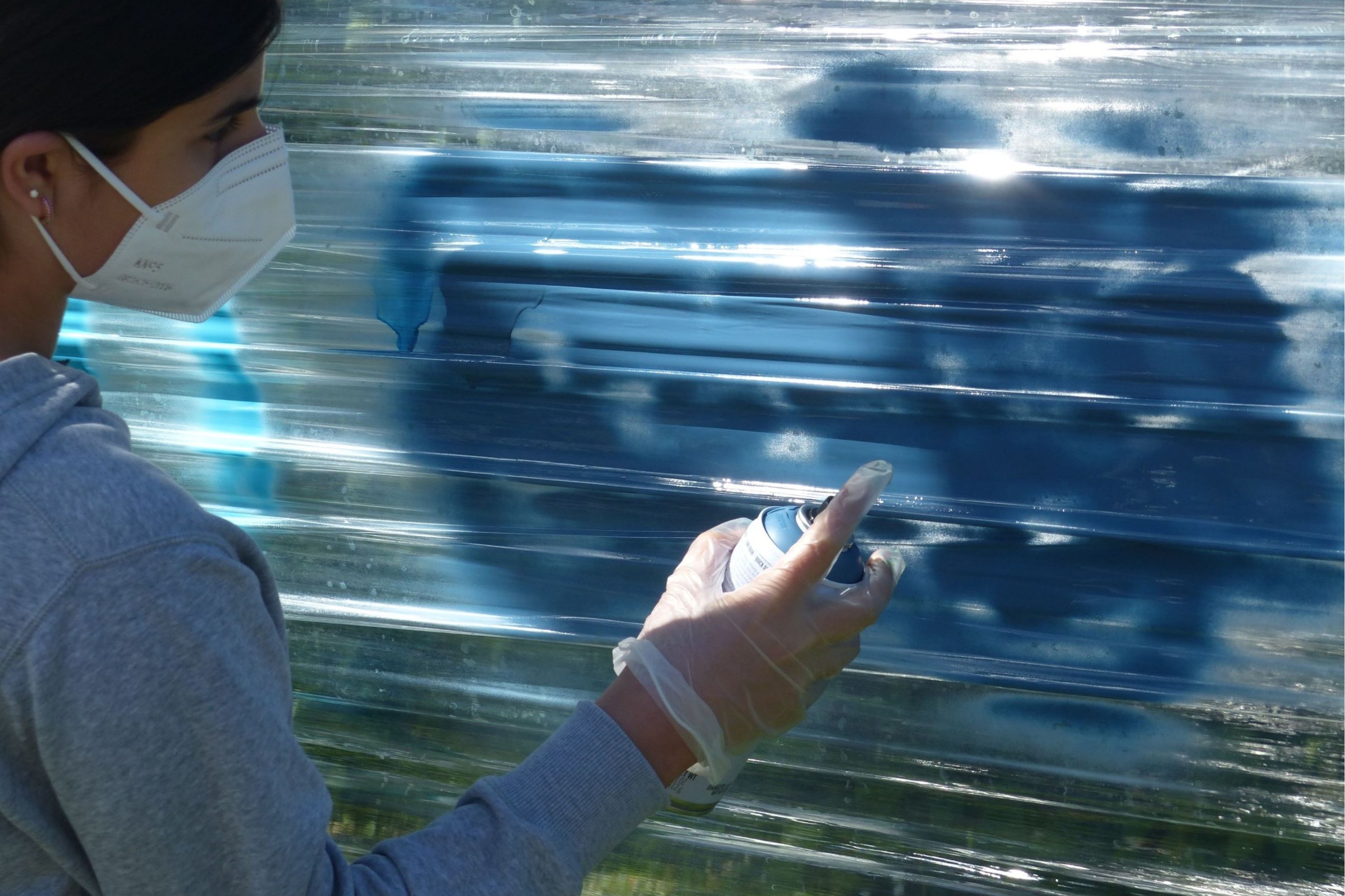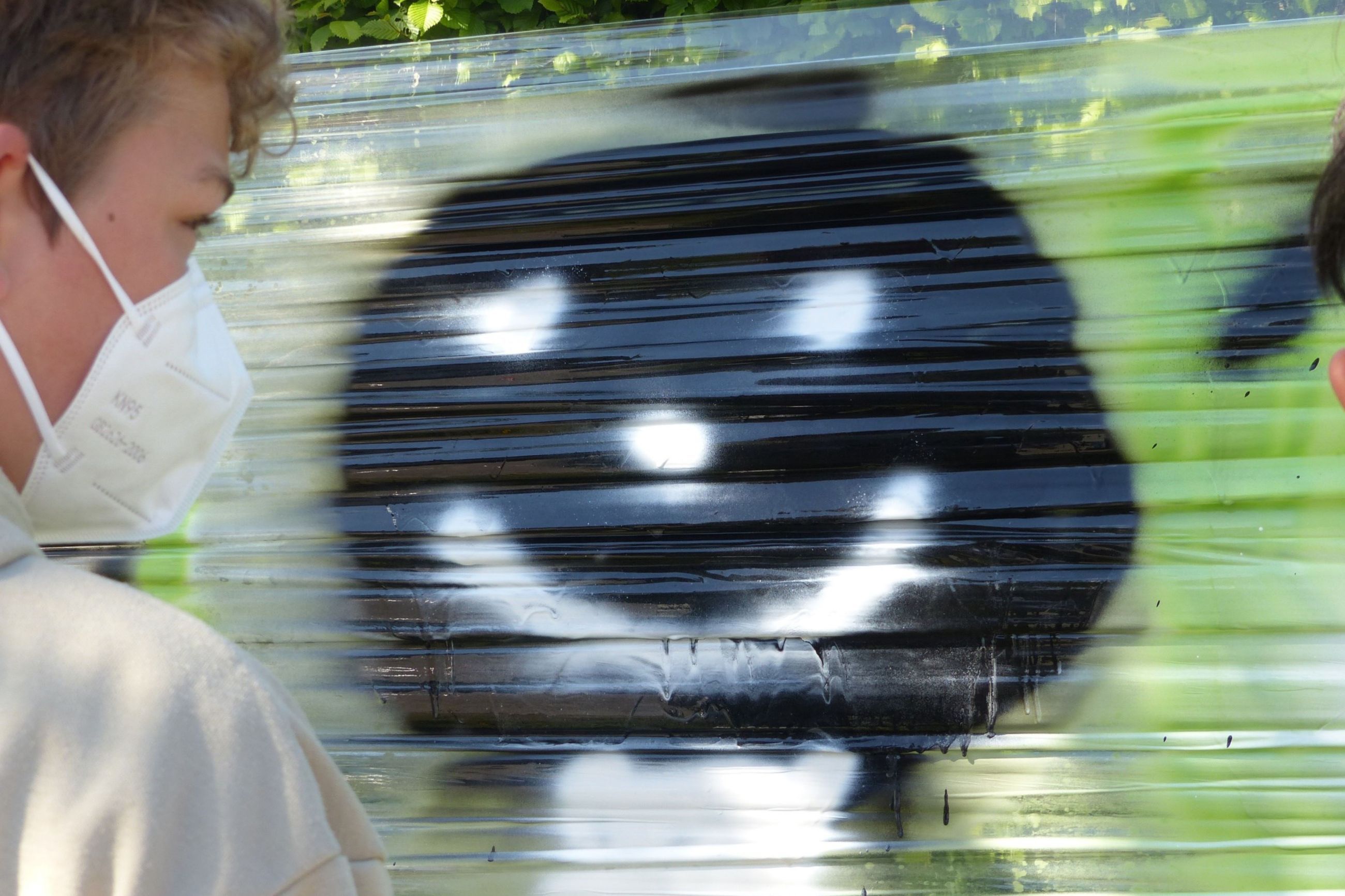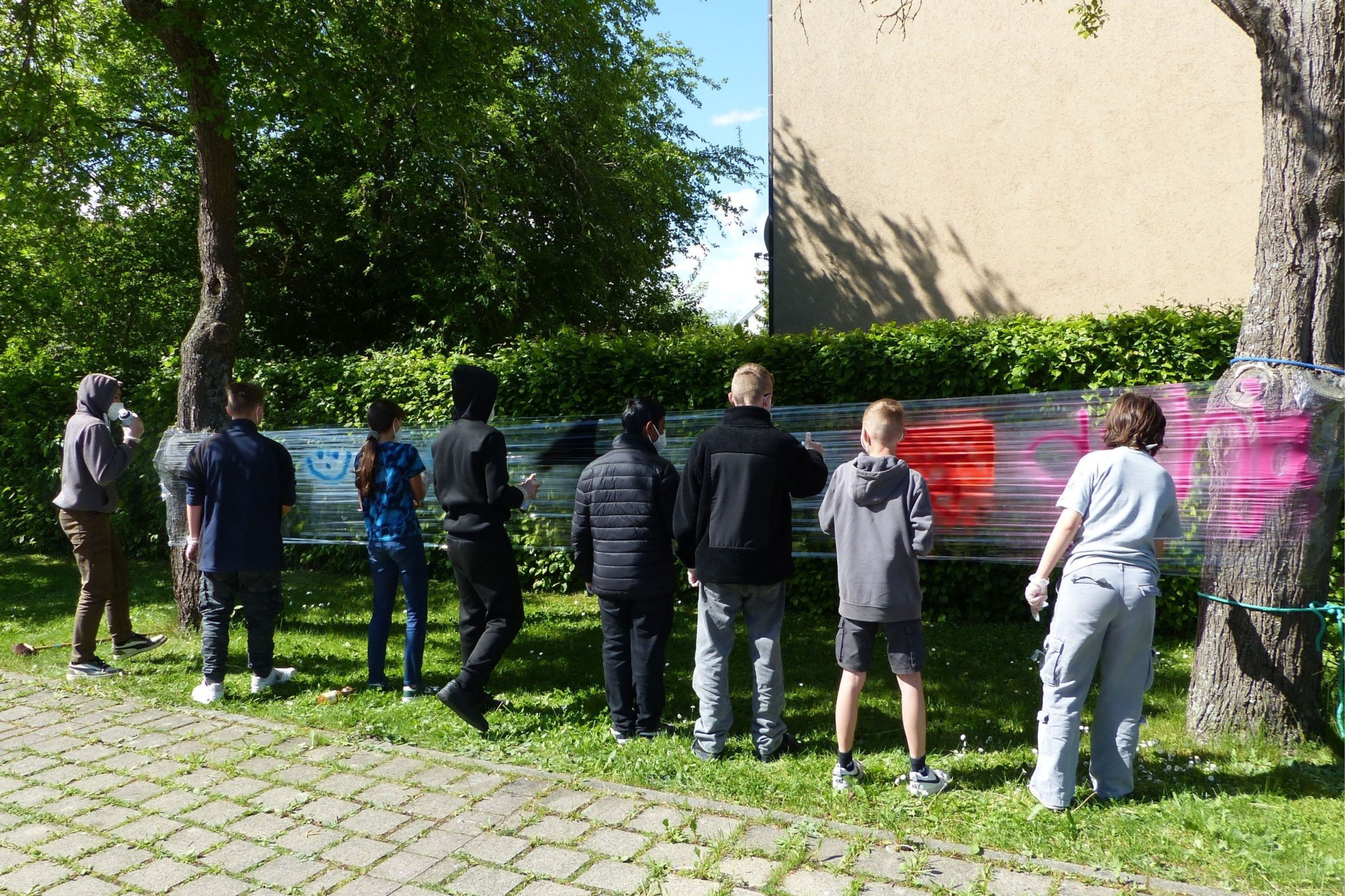 Dazu waren auf dem Gelände des Förderzentrums Rothenburg unter Leitung von Hern Hofmann Folienbahnen zum Besprayen erichtet worden. Unter der Beachtung wichtiger „Sprayregeln" ließen die Schülerinnen und Schüler ihren kreativen Vorstelungen freien Lauf und erstelten ein beachtenswertes Gesamtkunstwerk.