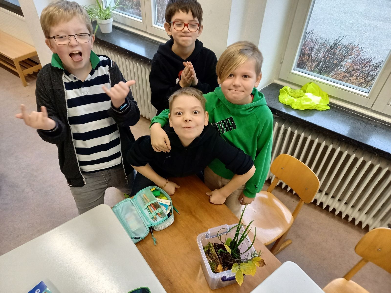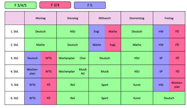 In diesem Schuljahr haben wir die Besonderheit einer jahrgangsgemischten Klasse F3/4/5. Jahrgangsgemischte Klassen erfordern eine hohe didaktische Planung des Unterrichts, bieten aber auch die große Chance des Voneinander Lernens (vgl. Jenaplan). Dies versuchen wir im Lehrertandem mit Lernstandsdiagnosen, Lerngruppen und offenen Unterrichtsformen umzusetzen.