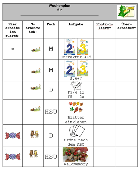 Damit jedes Kind entsprechend seinen Bedürfnissen und Möglichkeiten lernen kann, wird im Unterricht an einem gemeinsamen Gegenstand gelernt, dieser aber vielfältig differenziert. Eine Möglichkeit hierfür ist unser Wochenplan, in dem die Schüler Reihenfolge, Tempo, Sozialform und Zusatzaufgaben selbst wählen können und somit ihre Selbstständigkeit steigern: